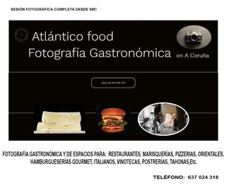 Atlántico Food FOTOGRAFÍA GASTRONÓMICA en A Coruña Presente sus platos y el espacio donde se disfrutan con una imagen profesional que le ayudará a conseguir credibilidad y confianza. Mejore sus reservas, fidelice clientes. Refuerce su presencia como negocio en los medios: Web, Redes Sociales (Instagram-Facebook), etc. También Videopromos bajo demanda, VT360º... Llame sin ningún compromiso al teléfono 637 024 318 atlanticofood.wixsite.com/atlanticofood