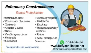 Se hacen Reformas precios economicos.. albañilería, instalaciones baños, instalación suelos, alicatado, fontanería, mamparas y platos ducha, montaje de pergolas, etc.. Poda jardines, corte de palmeras, electricidad, etc.. Somos profesionales, buenos precios, presupuestos sin compromiso.. Zona (Benidorm, alfaz, albir, Altea, villajoyosa, campello, etc..)