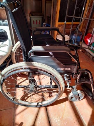 silla de rueda reclinable muy cómoda con respaldo y asiento especiales para prevenir q le salgan escara ,con el respaldo q se puede abatirse para ponerla de varias inclinaciones ,con apoya cabeza regulable ,apoyabrazos muy cómodo,y reposapiés q pueden subirse a alturas ,prácticamente para poner horizontalmente al usuario ,lleva incorporado un refuerzo lateral y las ruedas traseras son grandes para poder subir más cómodamente ,escalones .... Tiene un par de desperfecto como se puede ver en las dos últimas fotos q es mas q nada estético ,no influye para nada en el funcionamiento y calidad del producto.Regalo saco y plástico de lluvia