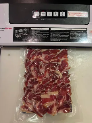 Corto jamón a cuchillo y lo envaso al vacío en paquetes de 100gr Si tienes algún jamón de un aguinaldo o de regalo o lo compras y se te seca o tus hijos estudian fuera la mejor solución para su conservación