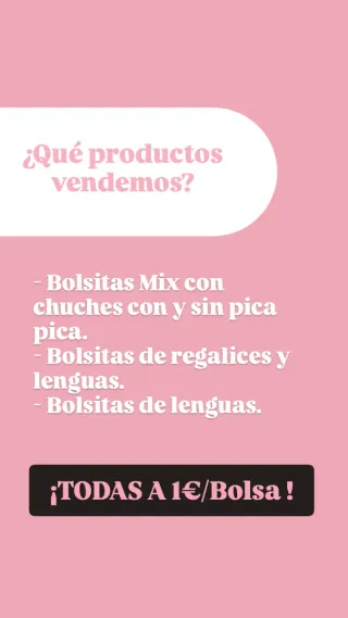 ¡Hola, somos Chuches Malta! 🇲🇹🍬 Vendemos bolsitas de chuches a 1€ la bolsa; en mano y por envío para fiestas, eventos, cumpleaños... ¡Y solo cobramos el valor de la bolsa! 🎉 Tenemos como objetivo dar un toque dulce a vuestras vidas y recaudar dinero para nuestro viaje de fin de curso. 🍭✨️🎂 Cualquier duda sobre las diferentes bolsitas que ofrecemos, lugar de entrega en persona, número de bolsas... ¡estaremos encantadas de resolverla! ✅️