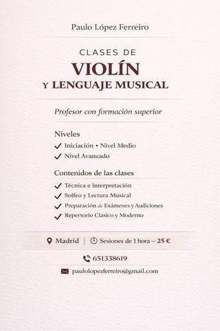 Clases particulares a domicilio de violin y lenguaje musical para todos loa niveles. Me adapto a las necesidades de cada alumno.