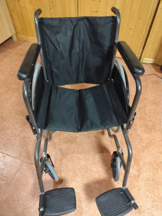 Silla de ruedas desmontable con reposabrazos y reposapiés. En buen estado. De fácil transporte y cabe en cualquier coche. Peso 12 kg