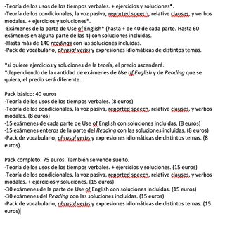 Hola, estoy en cuarto de Filología Inglesa. Cuento con un nivel alto (C1) certificado por Cambridge. Vendo material recolectado (y en su mayoría hecho) por mí. Si tienen alguna duda sobre algo, o quieren algo en concreto, no duden en preguntarme 😊. Los precios y lo que incluye cada cosa (también vendo cosas sueltas) están en las imágenes. El material se proporciona online.