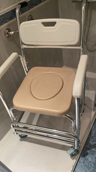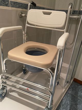 Silla de ducha y WC con estructura metálica y asiento acolchado. Nueva. - Asiento con apertura. - Reposabrazos. - Respaldo. - Ruedas para facilitar el desplazamiento.