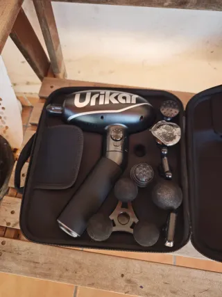 pistola de masaje profesional de percusión para terapia muscular, específicamente el modelo Urikar Pro 2 con función de calor, Viene en un estuche de transporte con múltiples cabezales intercambiables para tratar diferentes grupos musculares, incluyendo cabezales de bola para músculos grandes y cabezales tipo bala para puntos gatillo.