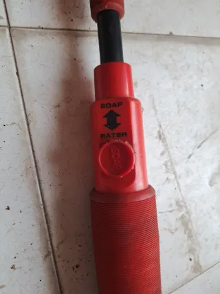 mango de cepillo de limpieza con dispensador de jabón integrado. Cuenta con un selector para alternar entre el uso de jabón y solo agua. Diseño ergonómico con agarre estriado para mayor control durante el uso. Longitud extendida para alcanzar zonas altas o difíciles. Incluye una conexión estándar para mangueras de jardín.