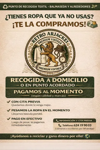 🌟 Servicio: Compramos lotes grandes de ropa y vaciados de armarios. 📏 Zona: Nos desplazamos por Balmaseda y alrededores. 📦 Especialidad: Compramos por volumen para clasificación de fardos. 💎 Estado: Ropa limpia y sin taras (sin manchas ni roturas). 🎨 Marcas: Aceptamos todo tipo de ropa (marcas y básicos). 💡 Condiciones de compra: 🏠 Recogida a domicilio: Nos encargamos de todo el transporte. ⚖️ Pago por PESAJE: Pesamos tu lote en el momento con báscula propia. 💶 Dinero al INSTANTE: Pago en efectivo según el peso total del lote. 📅 Cita previa: 624 19 90 03. 🧥 Ideal para: Quienes necesitan vaciar habitaciones o traster