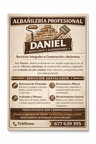 Albañil serio y responsable en Benicarló y alrededores. Realizo todo tipo de trabajos de albañilería, reformas y reparaciones. Trato cercano, precios ajustados y trabajo bien hecho. 🔹 Colocación de suelos y azulejos 🔹 Reformas de viviendas 🔹 Reparación y construcción de muros 🔹 Pintura y acabados 🔹 Pequeñas y grandes reparaciones Presupuesto sin compromiso. Escríbeme por Wallapop y lo hablamos 👍