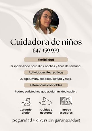 Soy una persona responsable, dedicada y con experiencia en servicios de limpieza y cuidado de niños. Ofrezco un trabajo organizado, puntual y de confianza, adaptándome a las necesidades de cada familia u hogar. Cuento con habilidades para mantener espacios limpios, ordenados y agradables, así como para atender a niños con cariño, paciencia y atención. Servicios que ofrezco: Limpieza general de pisos (familiares o turísticos) Orden y mantenimiento diario. Limpieza profunda de cocina, baños y áreas comunes. Lavado, planchado y organización. Cuidado de niños, supervisión actividades recreativas y acordes a sus necesidades.