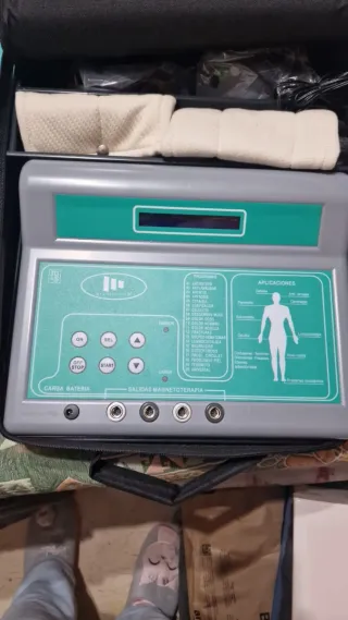 Equipo de magnetoterapia profesional con múltiples programas y aplicaciones. - Pantalla digital. - Botones de control: ON, OFF/STOP, SEL, START, y flechas de navegación. - Salidas para magnetoterapia. - Indicador de carga de batería.