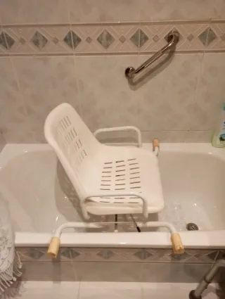 Silla para la bañera, ideal para personas mayores, personas con movilidad reducida o en rehabilitación. - Estructura metálica resistente - Asiento de plástico con agujeros para el drenaje del agua - Respaldo y brazos para mayor seguridad - Tapones de goma antideslizantes Es muy estable y cómoda, y se encuentra en buen estado. Fácil de llevar y colocar, no necesita instalación.