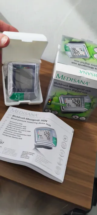 tensiómetro de muñeca digital, específicamente el modelo Medisana HGN. Proporciona mediciones automáticas de la presión arterial y el pulso directamente en la muñeca. Función de semáforo: Clasifica los valores de presión arterial utilizando una escala de colores basada en los estándares de la OMS. Detección de arritmias: Capaz de identificar ritmos cardíacos irregulares.