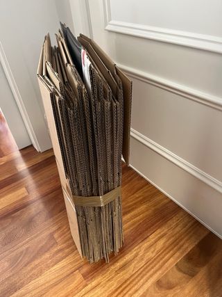 20 cajas para mudanza Dimensiones (largo x ancho x alto): 40cm x 26cm x 31 cm Tienen buen tamaño para llenarlas y que no pesen en exceso. Usadas para una única mudanza, como nuevas