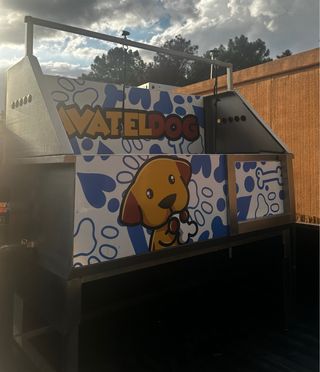 Bañera para el autolavado de perros Diseñada para facilitar el aseo de mascotas. - Estructura metálica y resistente como nueva - Decoración temática de perros y huesos. - Soporte superior para sujerar al perro en la bañera. 1 año de uso se vende por cese de actividad Nueva costo 8000/10000€