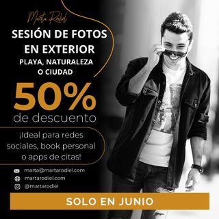 ✅ Reserva tu cita durante el mes de junio y benefíciate de un 50% de descuento exclusivo. Incluye: Sesión fotográfica en playa, naturaleza o entorno urbano (tú eliges el estilo que más te inspire). Edición y retoque profesional de las 10 mejores fotos de la sesión. Entrega en archivo de alta calidad mediante transferencia electrónica. Opcional: adaptación de las imágenes para redes sociales. 🌿 Promoción válida solo en junio. 💌 Para más información y reservas, no dudes en contactar.