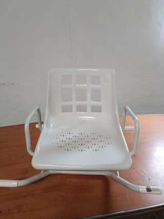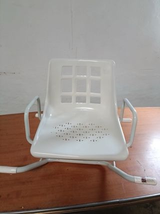 Silla de baño con diseño moderno y funcional. - Estructura de metal resistente. - Asiento y respaldo de plástico. - Brazos de apoyo. - Patas antideslizantes.