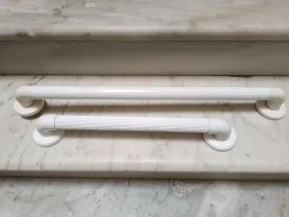 Juego de dos barras de seguridad de PVC, estriadas para asegurar una mayor sujeción y evitar que resbale. ideales para escaleras o baños. Su diseño es sencillo y funcional. Dos tamaños 48 y 70 cm. - Van atornilladas lo que ofrece una mayor seguridad y estabilidad respecto a las q van con ventosa. Cuenta con embellecedores que ocultan los tornillos. Se pueden comprar por separado por 8 eur. cada una o el juego por 14 euros.