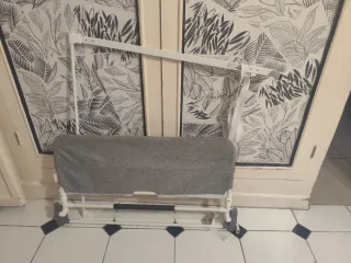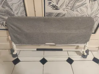 Barandilla de cama de tela gris con estructura metálica. - Funda de tela gris. - Estructura de tubos blancos. - Asa negra. - Base gris.