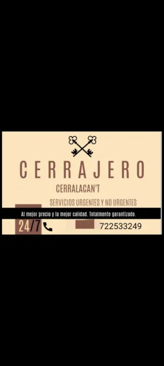 Cerrajeros profesionales con amplia experiencia. Servicios de urgencia 24h todos los días . Profesionalidad, rapidez y compromiso. SERVICIOS * Reparacion persianas y cierres metálicos de locales comerciales. * Apertura de todo tipo de puertas. * Cambio de bombines, cerraduras e instalación de cerrojos de seguridad. * Conversiones de cerradura de gorjas a europerfil. * Reparacion y mantenimiento de cerraduras * Desahucios * Urgencias 24h todos los días. Puede consultar nuestros precios sin compromiso. 722533249 whatsapp