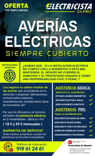 ¿Problemas eléctricos en casa? ¿Obra en marcha o reforma? Soy electricista profesional con años de experiencia. 🔧 Reparaciones urgentes sin esperas 🏠 Reformas eléctricas completas (pisos, locales, oficinas) 🚫 No dependas del seguro, cobraremos directamente ✅ Asistencia el mismo día – presupuesto sin compromiso 💬 Atiendo por WhatsApp y teléfono 💳 Pago en efectivo, Bizum o transferencia 📍 Trabajo en toda Madrid y alrededores ¡Servicio rápido, profesional y de confianza! 📞 [Javier] – [622929823]
