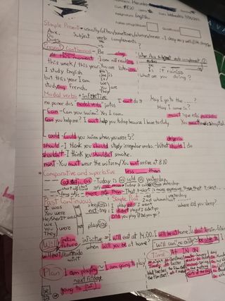Apuntes hechos por mí manualmente de la asignatura de Inglés para primero de la ESO con libro y profesores. Los apuntes son de todo un tema e incluye: explicaciones con esquemas, ejercicios resueltos, dictados, present simple, present continuous, modal verbs, comparative and superlative..., adjetivos - oppositive, create sentences, varios ejemplos con dibujos, traducciones y más. Hay algunos ejercicios que puedes hacer tú a base de los que han sido hechos anteriormente😉 No me digáis de pasar el n⁰ de 📱 ni me lo paséis porfa, mejor hablarlo en este chat.