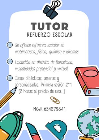 Me llamo Alan. Doy clases presenciales en todo Barcelona y cercanías. Me especializo en refuerzo de matemática, física y química para ESO y Bachillerato. Procuro que las clases sean personalizadas, amenas y adaptadas a mis alumnos. Soy un maestro empático, asertivo, siempre orientado a resultados. Si necesitas idiomas sé gramática en lengua castellana, y hablo francés e inglés. Mi tarifa para clases habituales son 10 euros la hora. 12 euros si es por una o dos veces. Si os interesa mis servicios, me envían un mensaje para coordinar disponibilidad previa. Mi móvil se muestra en la foto del aviso. Un saludo.