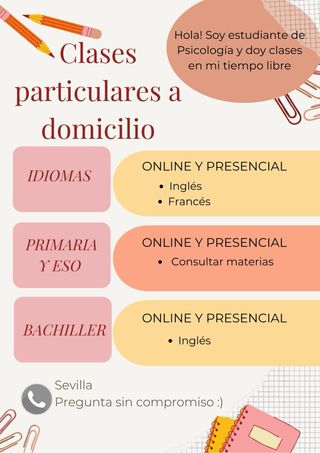 Hola! Yo soy Ana e imparto clases de apoyo en inglés y otras materias🇬🇧 para niños de Primaria, ESO, Bachillerato y Grado (niveles A1, A2, B1 y B2). Aunque también he dado clases a adultos, me encantan los niños! Tengo una experiencia estupenda de 3 años en clases normales e inmersivas de inglés, pero también otras asignaturas. Modalidad online y presencial si sois de Sevilla! - Matemáticas🧮 - Lengua📚 - Geografía🗺️ - Historia⚔️ - Biología🧬 - Francés🇫🇷 - Inglés🇬🇧❤️ - Economía📈