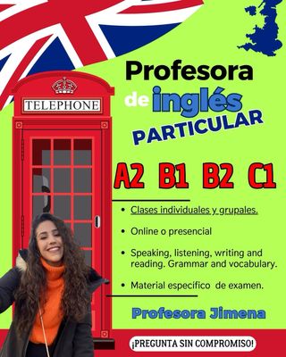 ¡Aprende Inglés con Profesora Nativa de EE.UU.! ¿Quieres mejorar tu inglés con clases personalizadas, dinámicas y adaptadas a tus objetivos? Soy profesora bilingüe con amplia experiencia enseñando a todos los niveles, desde principiantes hasta avanzados. ✅ Clases online o presenciales ✅ Preparación para exámenes oficiales (Cambridge, Linguaskill ,IELTS, TOEFL, etc.) ✅ Entrenamiento para entrevistas de trabajo en empresas internacionales ✅ Métodos efectivos y resultados garantizados Tarifas accesibles: 📍 30 min – 10€ 📍 45 min – 13€ 📍 1h – 17€ 🍀NO VOY A DOMICILIO !!! ¡No esperes más para mejorar tu inglés o avanzar profesionl