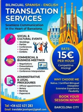 Need a reliable voice in Barcelona? I am Jose Lopez, providing expert English-Spanish interpretation to ensure you navigate the city with total confidence. For a flat rate of €15/hour, I offer seamless communication for: Admin & Legal: NIE/TIE appointments, banking, and notary meetings. Business: Meetings, trade fairs, and corporate presentations. Events: Weddings, conferences, and private city tours. Daily Life: Medical visits or apartment viewings. Local expertise and absolute reliability. Let's make your stay or business in Barcelona easier! Contact: 📞 +34 632 621 283 📧 translator.joselopez@gmail.com