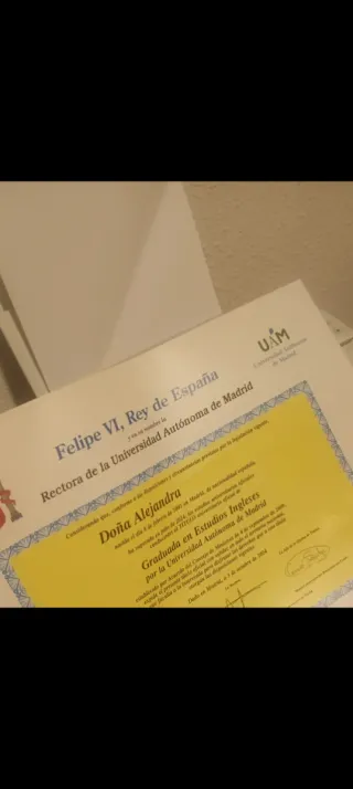 Buenas!! Soy Alejandra y tengo 23 años :) Este es mi segundo curso como profe en una academia de English Connection (doy clase desde infantil hasta adultos,hasta B2+). Llevo desde antes de entrar a mi carrera (Estudios ingleses) dando clases online y presenciales y,+5 años después, me gusta seguir haciendolo porque me encanta!! Mis títulos: B2 y C1 Cambridge y la carrera de Estudios Ingleses. Tengo experiencia preparando para oposiciones y exámenes Cambridge, para repaso del Cole e insti, temas de trabajo, clases orales, etc. Mi disponibilidad es de mañanas y fines de semana pero aún tengo algún hueco por las tardes! Coméntame