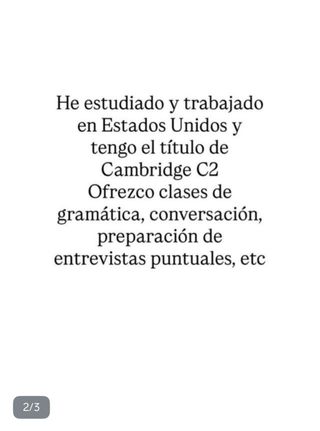 Profesora de inglés con más de 4 años de experiencia, con título de C2, habiendo estudiado la carrera de Relaciones Internacionales en inglés y experiencia viviendo en Estados Unidos. Clases adaptadas a cada alumno, también se ofrecen clases solo de speaking, de preparación de exámenes de gramática… Clases presenciales u onlines. Para más info escríbeme :)