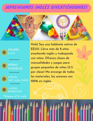 Hola! Soy una hablante nativa de EEUU. Llevo más de 8 años enseñando inglés y trabajando con niños. Ofrezco clases de manualidades y juegos para grupos pequeños de niños, con edades de 6 a 10. Me encargo de todos los materiales, las sesiones son 100% en inglés. Las clases son de 1 hora de duración y los grupos son reducidos (3-5 por clase). Normalmente los niños harán un proyecto de arte mientras practican su listening y speaking con una nativa. El coste es 10€ cada niño por clase de una hora. *Por favor, grupos de por lo menos 3 niños.