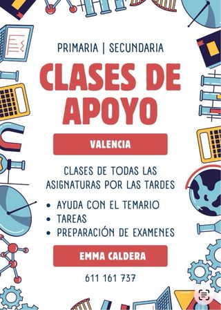 ¿Tu hijo/a necesita un refuerzo en el cole? Soy José Luis Garcia, profesor con experiencia en apoyo escolar para Primaria y Secundaria. - Refuerzo en Matematicas, Lengua, Sociales, Quimica, Biologia y Naturales. - Ayuda con deberes y técnicas de estudio. - Material de propio y fichas interactivas para reforzar en casa. - Clases personalizadas según el ritmo de cada alumno. Duración mínima: 1h por sesión. Zona: Valencia (a domicilio u online). Precio a negociar según necesidades y desplazamiento. ¡Primera clase de prueba gratuita! Contactame para consultar disponibilidad.