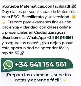📚 Clases particulares de Matemáticas Soy Guillermo, estudiante de último curso de Matemáticas en la Universidad de Zaragoza, y ofrezco clases de apoyo personalizadas para: 🔹 Primaria 🔹 ESO 🔹 Bachillerato 🔹 Primeros cursos universitarios (Economía, Ingeniería…) ✅ Método claro y práctico ✅ Explicaciones paso a paso ✅ Posibilidad de curso intensivo 🕛 Gran disponiblidad 📍 Presencial en Zaragoza (zona Universidad / Parque Grande) 💻 Modalidad online 💰 Tarifas • Primaria: 12 €/hora • ESO: 15 €/hora • Bachillerato: 18 €/hora • Universidad: a consultar 📩 Contacto por WhatsApp