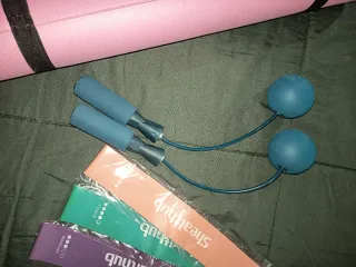 Alfombra para entrenar o pilates (10€) Elásticos sin estrenar (5€) Y comba inalambrica (10€)