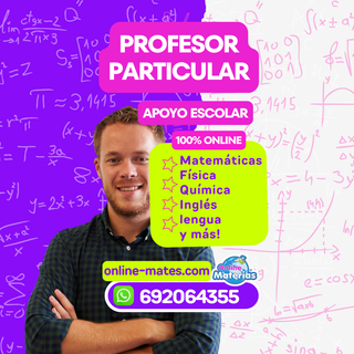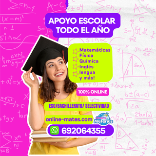 APOYO ESCOLAR con clases personalizadas, individuales y 100% Online para ESO/ BACHILLERATO y SELECTIVIDAD ✅ 📘 Clases de física, matemáticas, química, biología, lengua, inglés, francés y más! 📚Refuerzo Escolar todo el año, vacaciones, clases de emergencia para exámenes, deberes, tareas, dudas de materias y ayuda en general. Primaria y ESO : 12€/h 📝 Clases sueltas 📚Pack de 8 horas 80€ (10€/h) 🤩 1° y 2° BACHILLER, SELECTIVIDAD: 14€/h 📝 Clases sueltas 📚Pack de 8 horas 100€ (12.5€/h) 🕐 Escoge tus horarios y días para las clases! Te ofrecemos Flexibilidad! ¡CONTÁCTANOS! 📲 WhatsApp: 692 064 355 🌐 online-mates. com