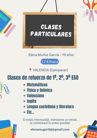 Hola! Soy Elena, estudiante universitaria y responsable! Tengo experiencia en dar clases particulares con alumnos de la ESO. Si estas buscando una profesora particular para tu hij@ y eres de la zona de Campanar (Valencia), no dudes en mandarme un email!