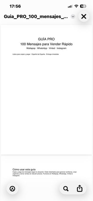 Guía digital PRO en PDF con 100 mensajes listos para copiar y pegar para vender más rápido en Wallapop. Incluye frases para: • Cerrar ventas sin discutir • Evitar regateos • Recuperar clientes que dejan en visto • Generar urgencia y confianza Funciona también en WhatsApp, Vinted e Instagram. ✅ Entrega inmediata tras el pago ✅ No es producto físico 💳 Pago por Bizum