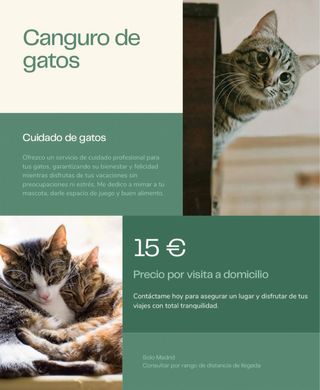 ¿Te vas de viaje y necesitas un cuidador de confianza para tu gato? 🐱 Soy Marta, psicóloga felina y amante de los animales. Cuido a tu amigo peludo a domicilio. Atiendo llamadas y Whatsapp de 8.00 a 23.00 de Lunes a Domingo. Tlf. 619 388 345. Modalidades de cuidado: - Visita express (30 min): Alimentación, agua y limpieza arenero. - Visita estándar (1 h): Además del cuidado básico, juego, mimos y compañía. - Visita premium (2 h): Atención completa para tu amigo peludo. Incluye paseo por campo, bosque o parque de alrededores. En todas las modalidades se realiza envío diario de fotos y videos. Servicio para todo Madrid.
