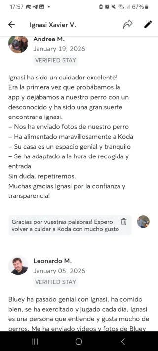 Hola, me llamo Ernesto y estoy disponible los fines de semana para cuidar y pasear perros en casa de los dueños. Me encantan los animales. Puedo encargarme de: • Paseos adaptados a las necesidades del perro • Dar de comer, cambiar agua y mantener su rutina • Jugar, dar compañía y supervisión • Envío de fotos y actualizaciones para que estéis tranquilos Soy responsable, puntual y me adapto a lo que cada perro necesite. Si buscas a alguien de confianza para los findes, ¡estaré encantado de ayudar! Empezaría a partir del finde 28 d noviembre Pregunta sin compromiso!!😁