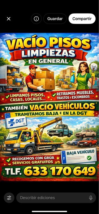 Vacio pisos y limpiezas en general presupuesto sin compromiso gratis atencion 24/7 expres tambien vacio vehiculos recojida de vehiculos para desguace baja en el acto en la DGT recojida con grua servicios gratuitos acudimos a su domicilio para mas informacion contacte con nostros anuncio 100x 100 real