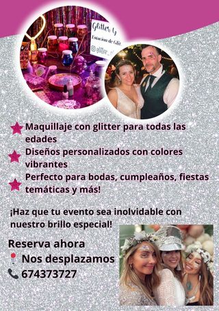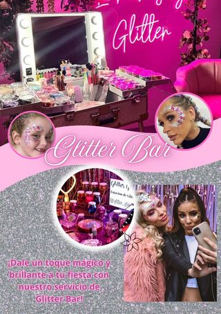 ✨¡Haz que tu evento brille con Glitter Bar!✨ ¿Quieres darle un toque único y mágico a tu fiesta? En Glitter Bar transformamos cualquier ocasión en una experiencia llena de color y destellos. Ofrecemos maquillaje con glitter, pedrería y diseños personalizados para que tú y tus invitados luzcan espectaculares. Ideal para: ⭐ Bodas ⭐ Cumpleaños ⭐ Despedidas de soltera ⭐ Eventos corporativos ⭐ Festivales y más Nos encargamos de todo para que solo disfrutes y brilles. ¡Reserva tu fecha y haz que tu evento sea inolvidable! Contáctanos para más información. ✨