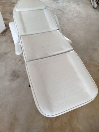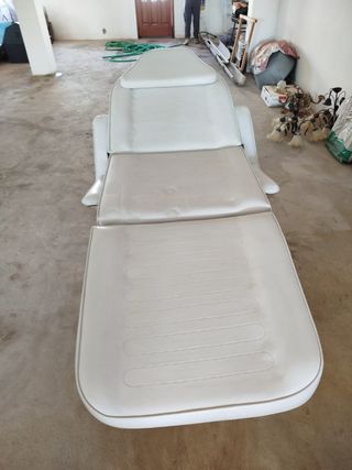 Camilla de masaje o técnicas de estética. Estructura de madera y patas metálicas. Tiene un desperfecto en una de las esquinas (última foto).