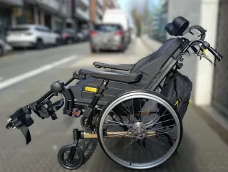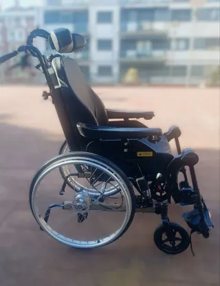 Silla de ruedas de posicionamiento CLEMATIS PRO en estado prácticamente nueva. Tiene solo 7 meses de uso real, unas 4 horas al día y casi siempre en interior, por lo que el desgaste es mínimo. Muy cómoda y completa: Basculación y reclinación Reposacabezas envolvente ajustable Reposapiés regulables Cojines confort incluidos Respaldo rígido Frenos de tambor Sistema antivuelco Puños regulables en altura