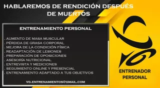 Si buscas un entrenador para adquirir hábitos saludables, mejorar tu composición física, ganancia de fuerza, preparación de oposiciones o cualquiera que sea tu objetivo no dudes en contactarme. Adaptaremos los entrenamientos a tus circunstancias, objetivos y necesidades con seguimiento semanal o quincenal. - Aumento de Masa muscular Muscular - Pérdida de grasa corporal - Mejora de la condición física - Readaptación de lesiones - Preparación de oposiciones - Asesoría nutricional - Entrevista y mediciones - Seguimiento online y presencial - Entrenamiento adaptado a tus objetivos WHATSAPP: 664 214 943 VG.ENTRENAMIENTOS@GMAIL.COM