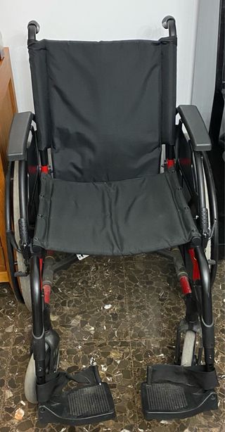- Silla aitopropulsable con ruedas grandes. - Plegable y ligera. - Estructura de acero rojo. - Freno manual.