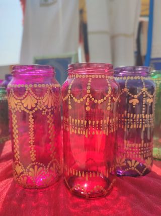 Conjunto de farolillos decorativos de cristal, elaborados a mano con un diseño inspirado en la artesanía moruna. Añaden un toque de color y estilo a cualquier espacio. - Diseño con detalles dorados. - Colores vibrantes: morado y rojo.