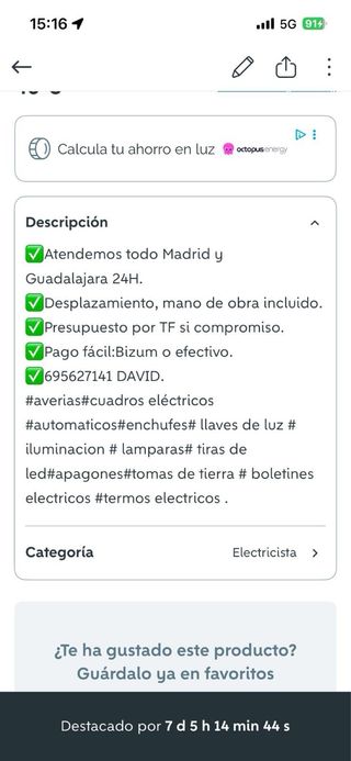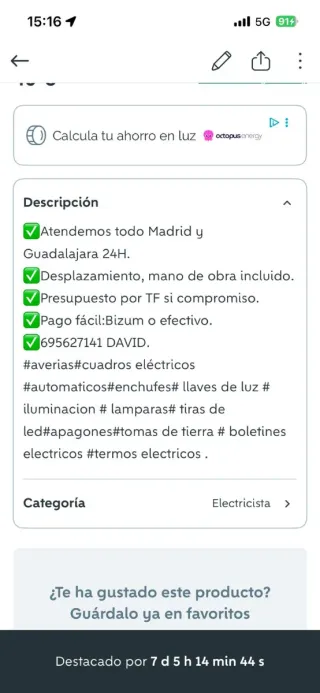 Descripción Atendemos todo Madrid y Guadalajara 24H. VDesplazamiento, mano de obra incluido. V Presupuesto por TF si compromiso. VPago fácil:Bizum o efectivo v695627141 DAVID. #averias#cuadros eléctricos #automaticos#enchufes# llaves de luz # iluminacion # lamparas# tiras de led#apagones#tomas de tierra # boletines electricos #termos electricos Categoría Electricista