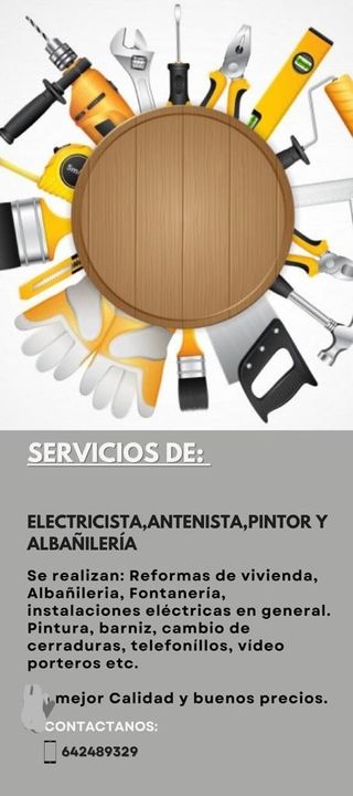 Hacemos Trabajos Reforma, Electricidad, Pintores, Antenista etc Precios sin compromiso Cualquier duda no dudes en contactar con nosotros en el teléfono 642489329